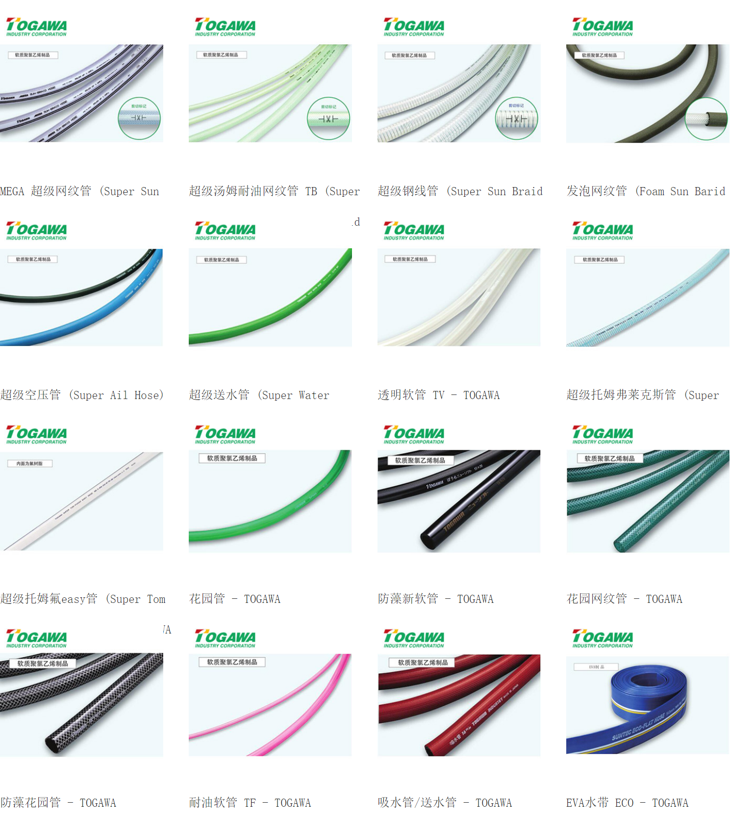 十川橡胶TOGAWA以下产品:TOGAWA胶管,TOGAWA工业软管,TOGAWA网纹管,TOGAWA喷漆管,TOGAWA塑料软管,TOGAWA食品级硅网纹管,TOGAWA真空管,TOGAWA油管,TOGAWA空气软管等等。