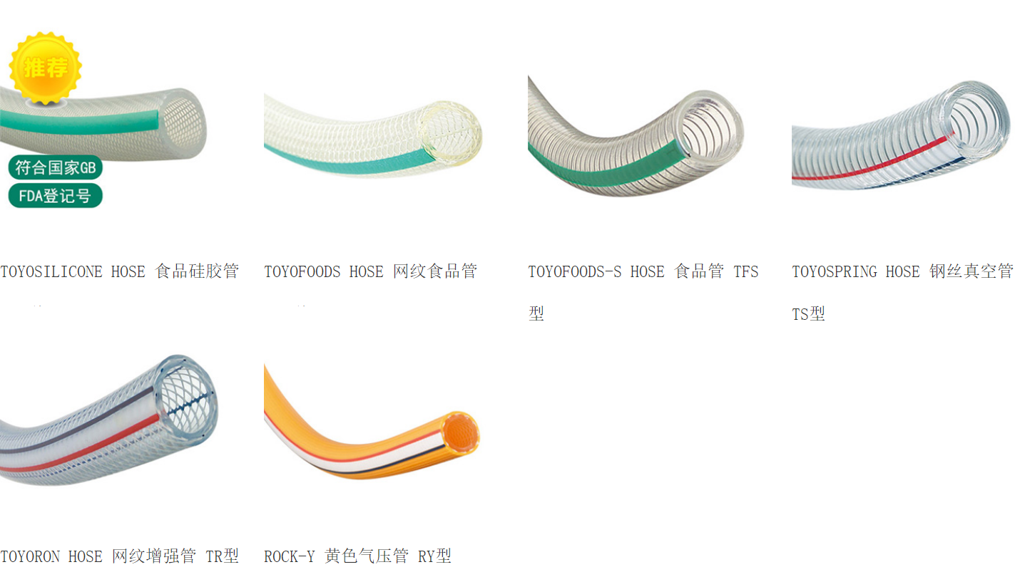 东洋克斯有着可满足所有行业及用途需求的胶管与接头。以工厂设备、机器配管用胶管及接头为代表,有着能满足耐热、耐油、耐药品、食品用胶管/接头、压送及真空需求的各种产品。