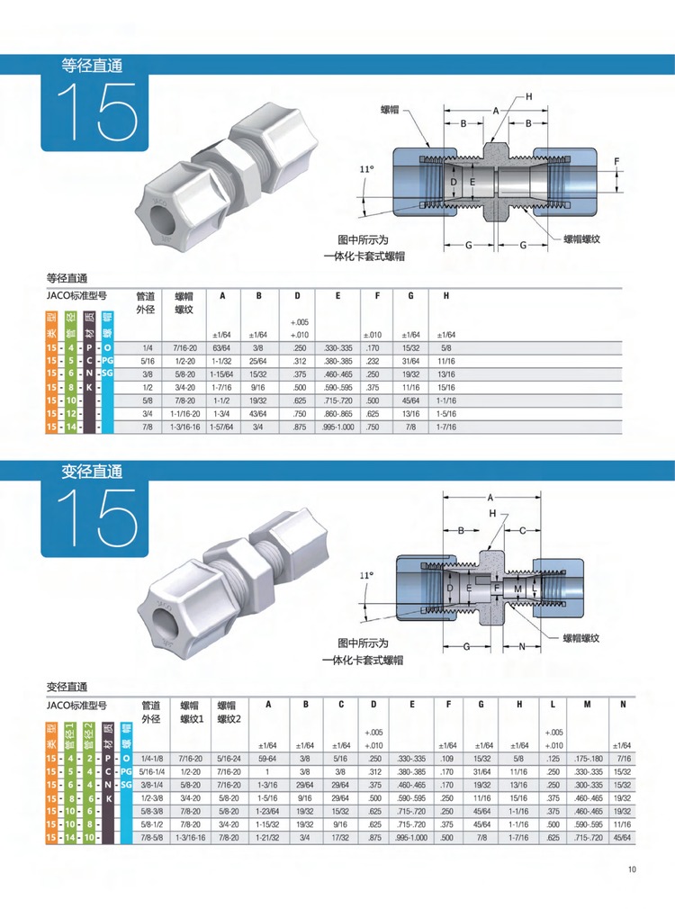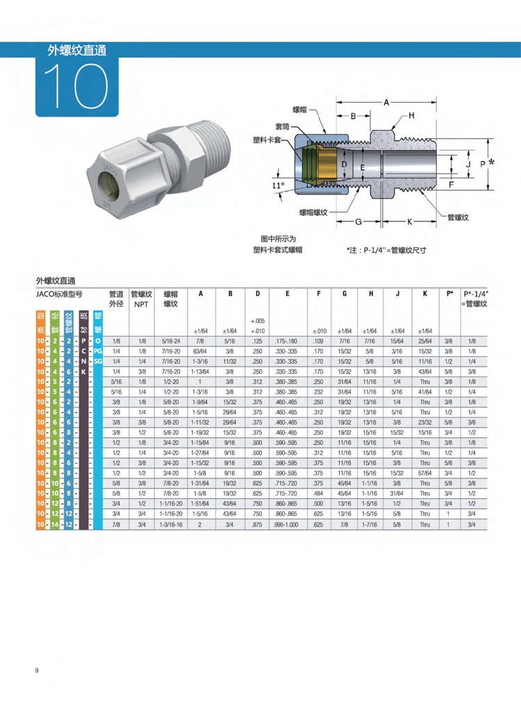 JACO卡套式接头适用于外径为1/8"-7/8"的英制尺寸管道,按种类可分为直通、三通、弯通、外螺纹直通等。