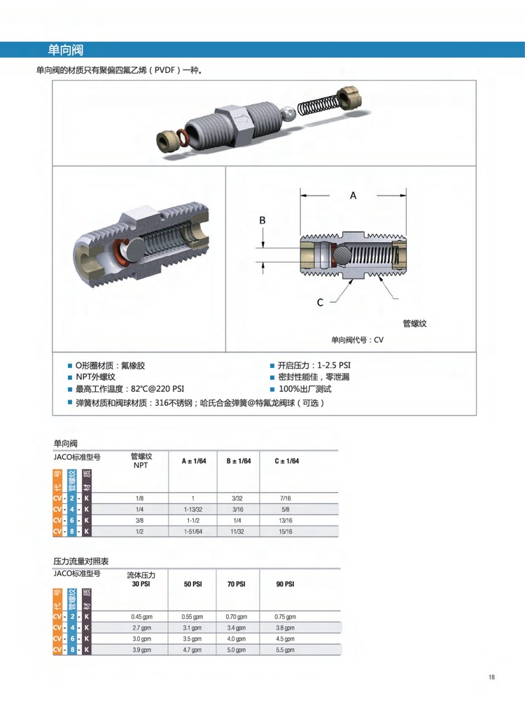 根据不同的使用环境,可选用不同材质的接头。JACO卡套式接头的材质可分为尼龙(Nylon)、共聚甲醛(Celcon)、聚丙烯(GFPP)和聚偏二氟乙烯( Kynar/PVDF )四种。