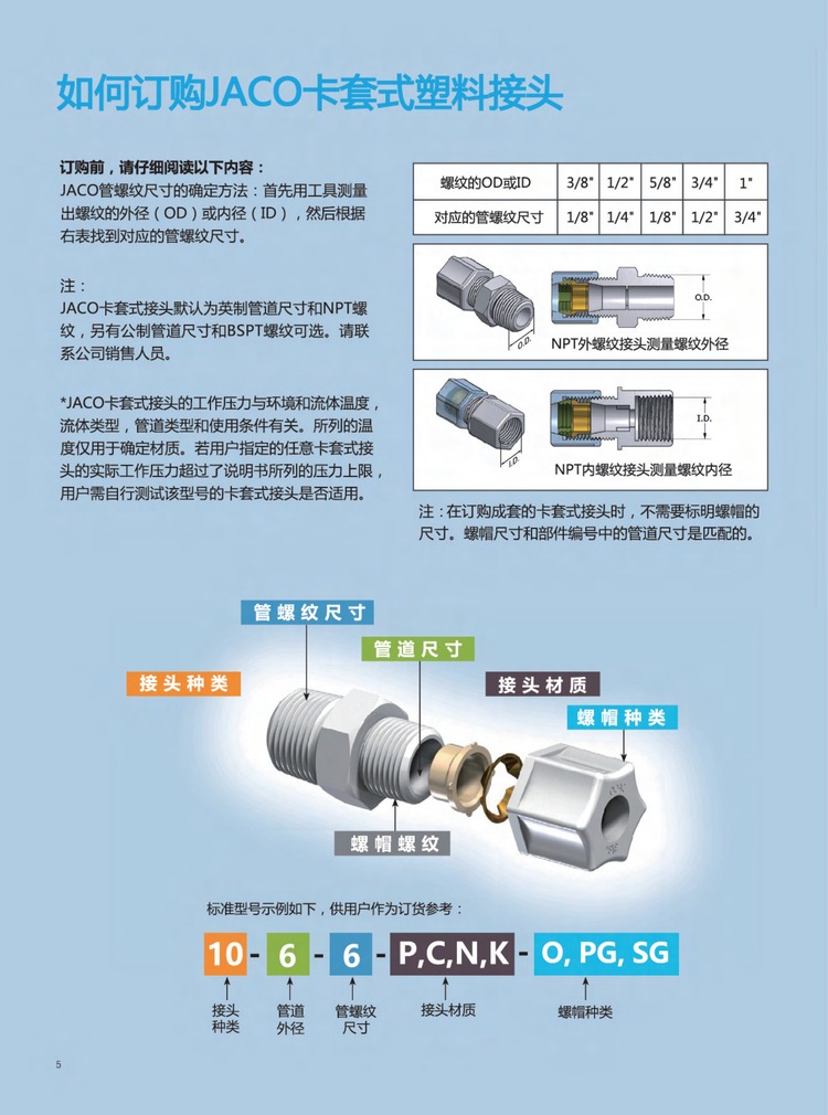 注:JACO可为客户定制公制尺寸、BSPT螺纹和黑色卡套式接头。如有需求,请联系公司销售人员。