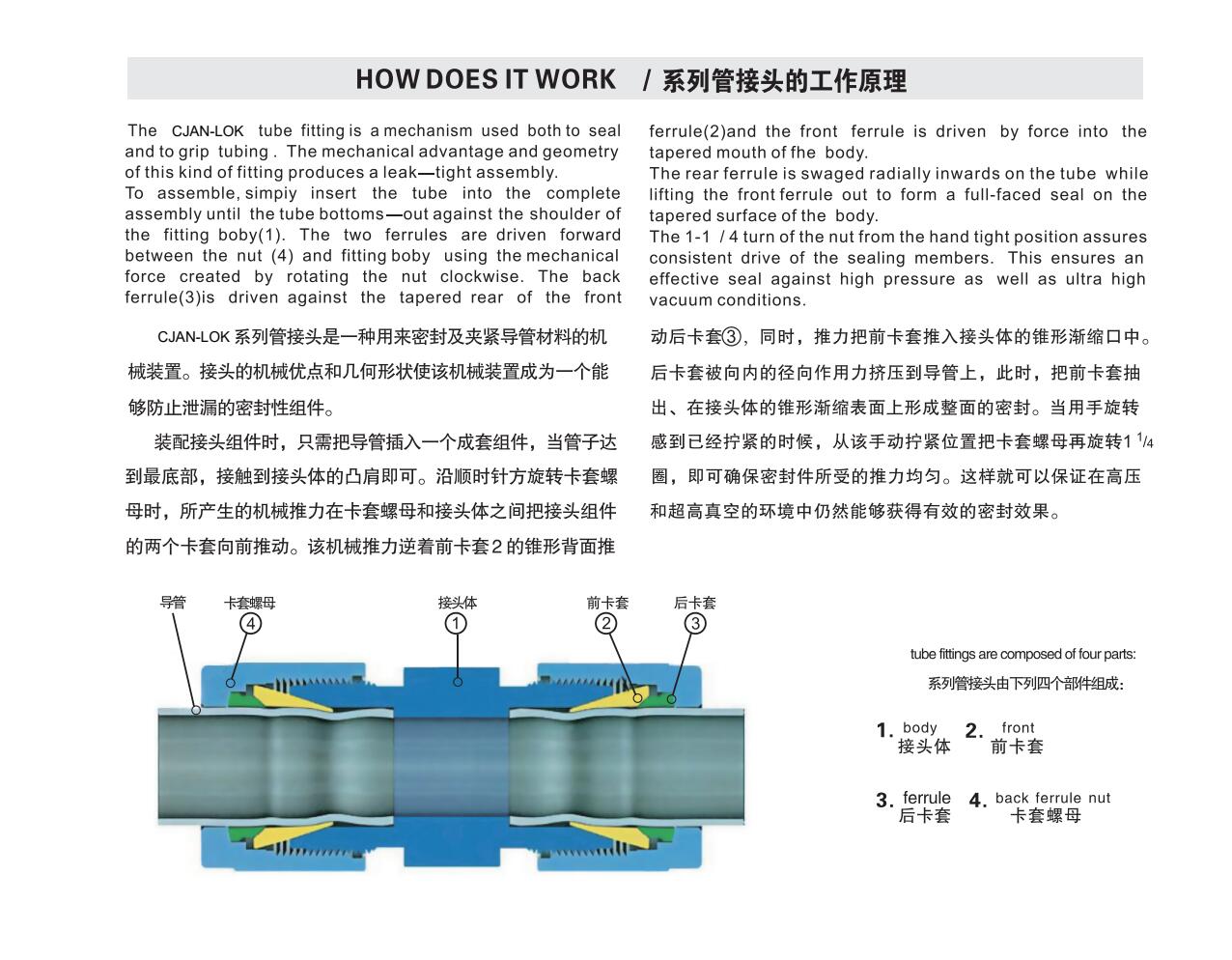 CJAN-LOK系列管接头是一种用来密封及夹紧导管材料的机械装置。接头的机械优点和几何形状使该机械装置成为一个能够防止泄漏的密封性组件。